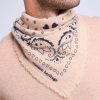 Maison Héritage propose une nouvelle version de son écharpe iconique Irma, réinterprétant le traditionnel bandana dans une version sophistiquée en 100% cachemire, autour d’une ode à l’amour de coeurs. Cette écharpe est à porter nouée sur un pull ou sur une veste, idéal à associer avec notre veste trompe l’oeil Denim Cachemire Jade.
