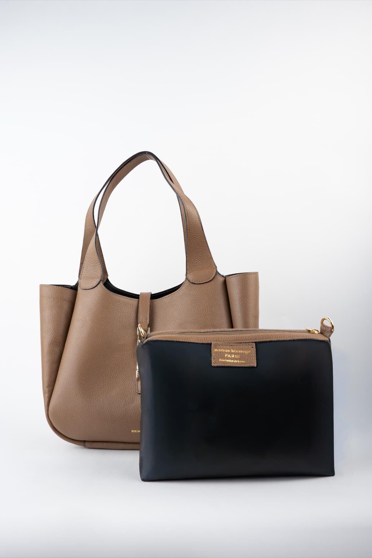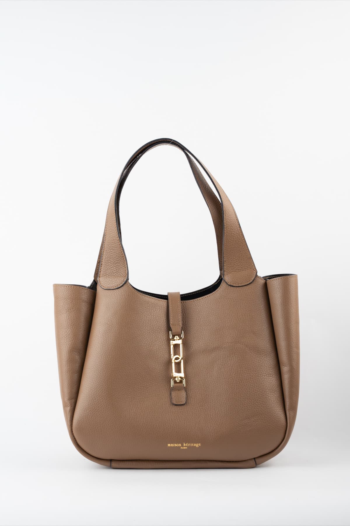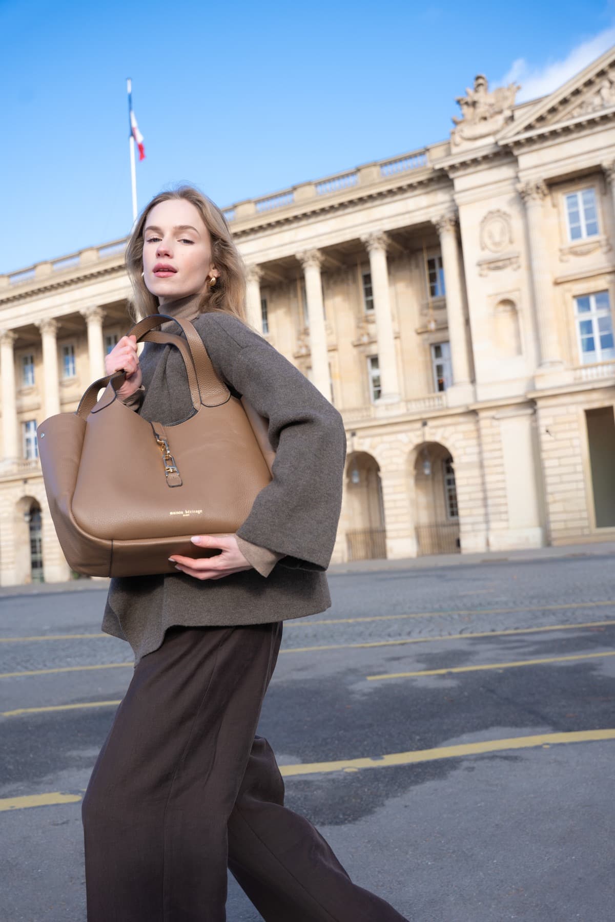 Type de sac : Sac cabas . Matière : Cuir grainé. Couleur : Taupe . Dimensions : 41 x 28 x 11 Accessoires : Couleur Dorée. Fermeture Principale : Crochet doré. Anses : Souples (porté main/épaule). Sangle Additionnelle : Amovible et Ajustable (pour porté bandoulière).Intérieur : Comporte une pochette intérieure zippée qui peut être accrochée à l’intérieur du sac ou porté en bandoulière