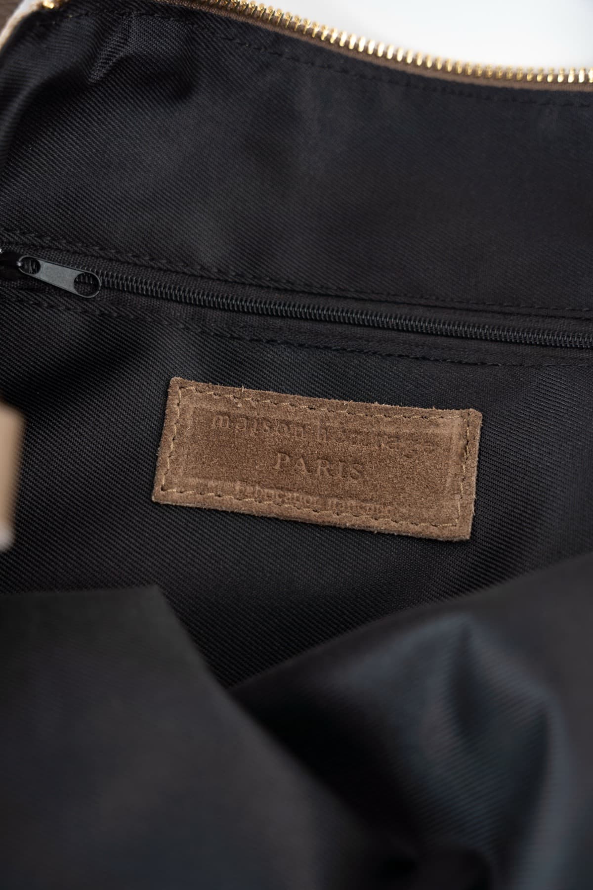 Design : Double lanière pour porté main/épaule ; Deux bandes en cuir grainé (détail) ; Fermeture : zippée couleur or ; Pochette intérieure zippée dans la doublure du sac