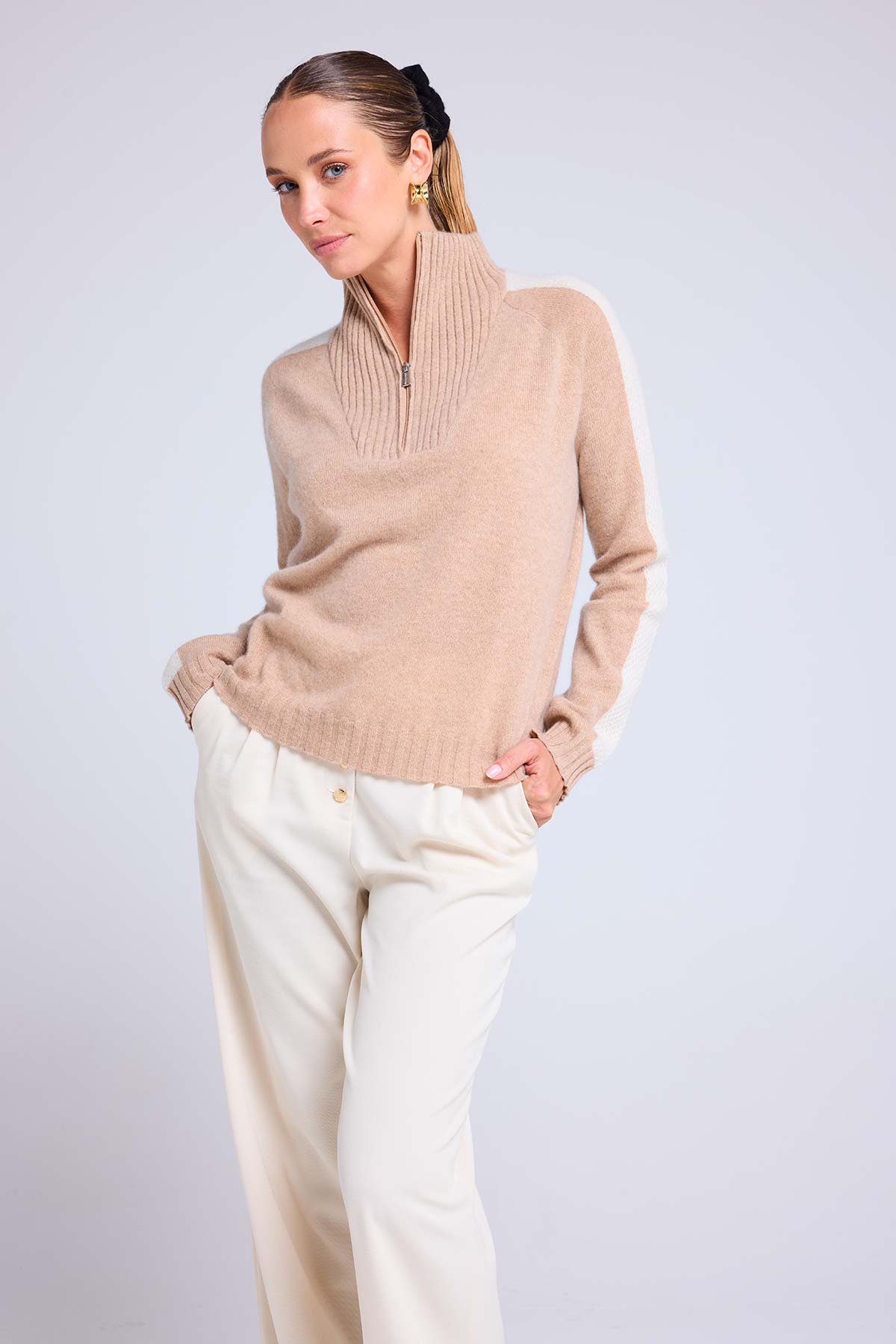 Illuminez votre vestiaire de saison avec ce pull 100% cachemire, muni d’un col camionneur zippé et montant, de manches longues et de bord côtelés. Il réchauffera votre silhouette avec des bandes en empiècements de points de mailles travaillés. Un jeu de contraste audacieux pour réchauffer vos looks de la saison. Autorisant tous les styles, il se portera autant sur un jean, une jupe, que sur un pantalon.