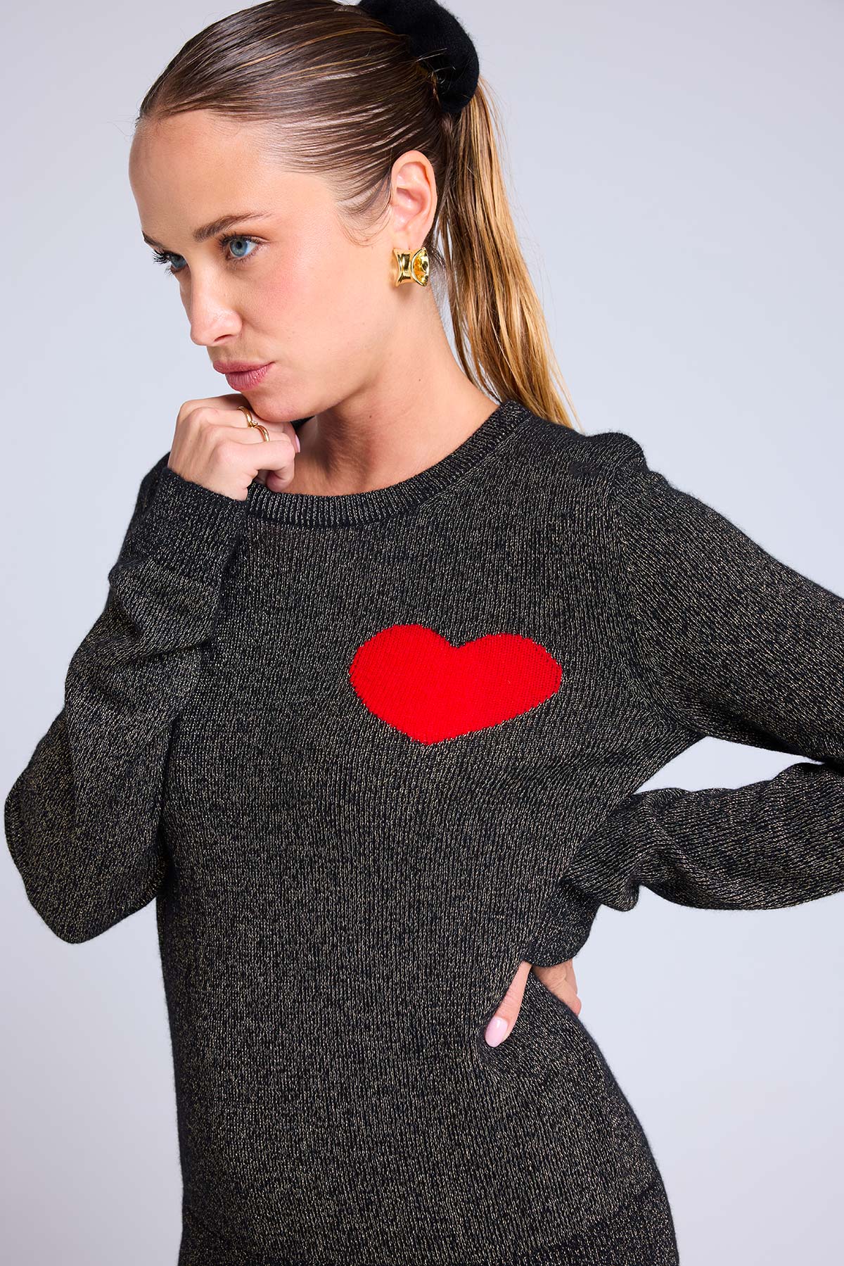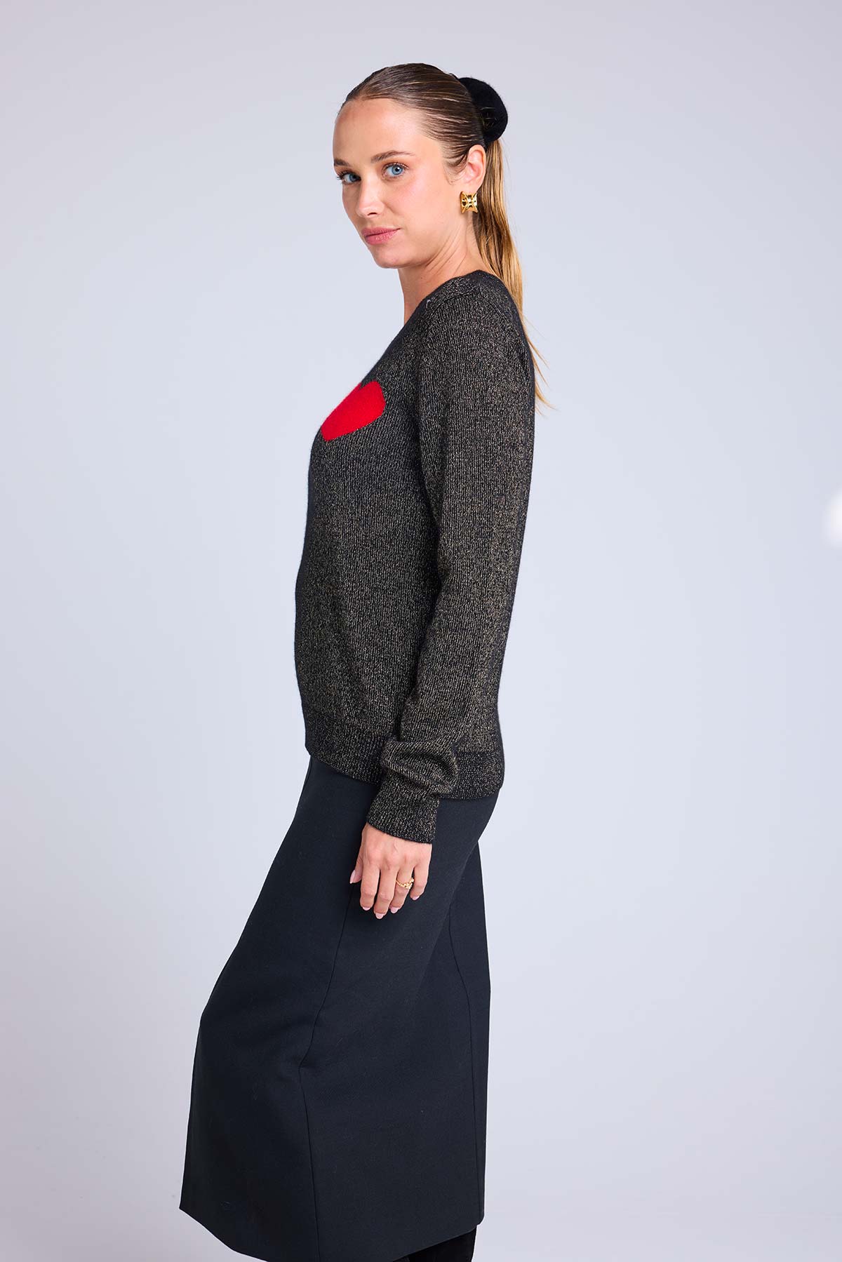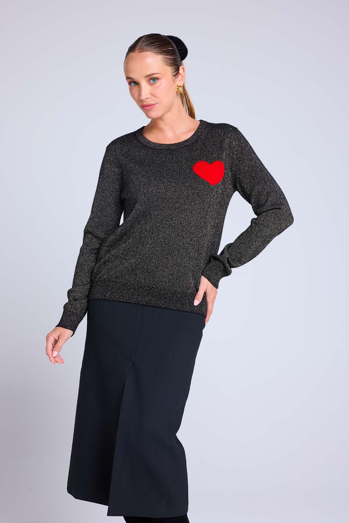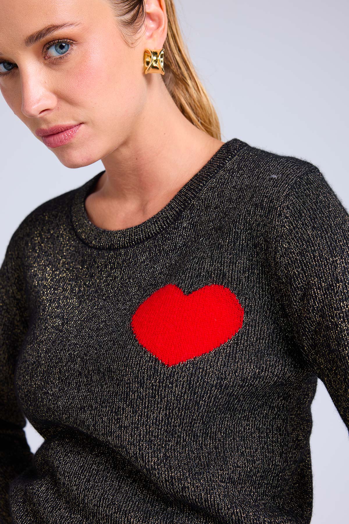 Sur la poitrine, un cœur rouge en intarsia apporte une touche graphique et féminine, signature Maison Héritage.