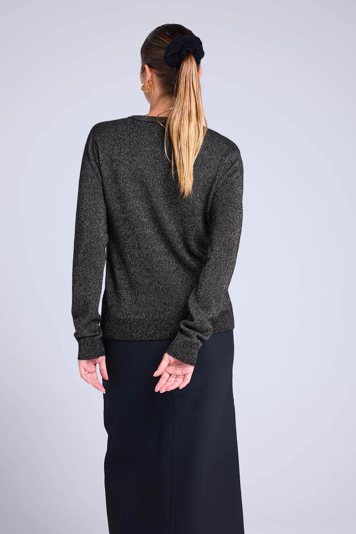 Tricoté en 100% cachemire, jauge 12GG, il mélange la profondeur du noir et l’éclat du lurex doré pour capter subtilement la lumière tout en offrant douceur et confort.