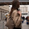 Sac en cuir porté épaule avec une poche intérieure, une fermeture principale à clip, et une bandoulière ajustable et amovible.