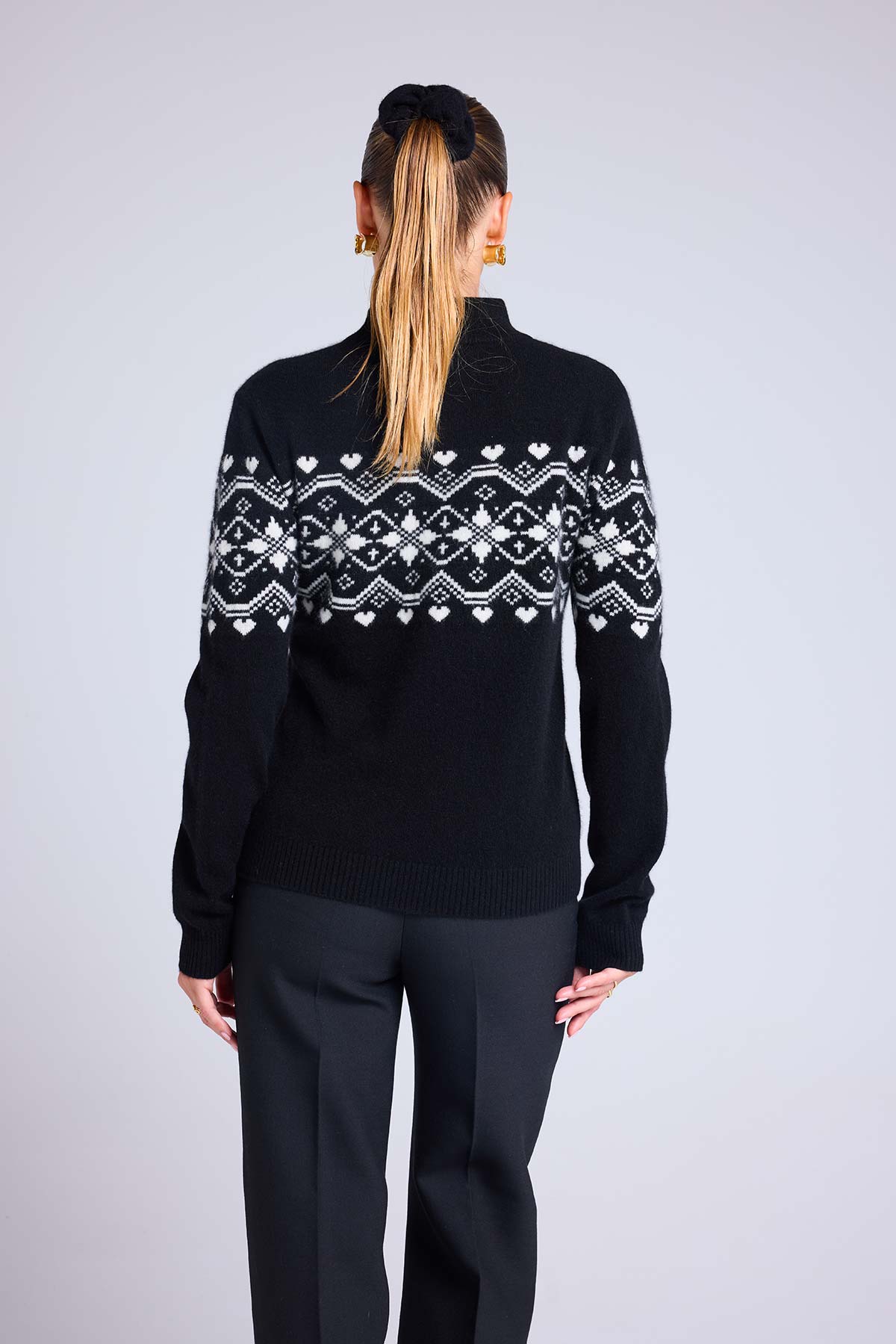 Son motif jacquard composé d’une frise géométrique et de petits cœurs apporte une touche féminine et raffinée, tandis que sa coupe ample et son col montant en font une pièce cocooning idéale pour l’hiver.