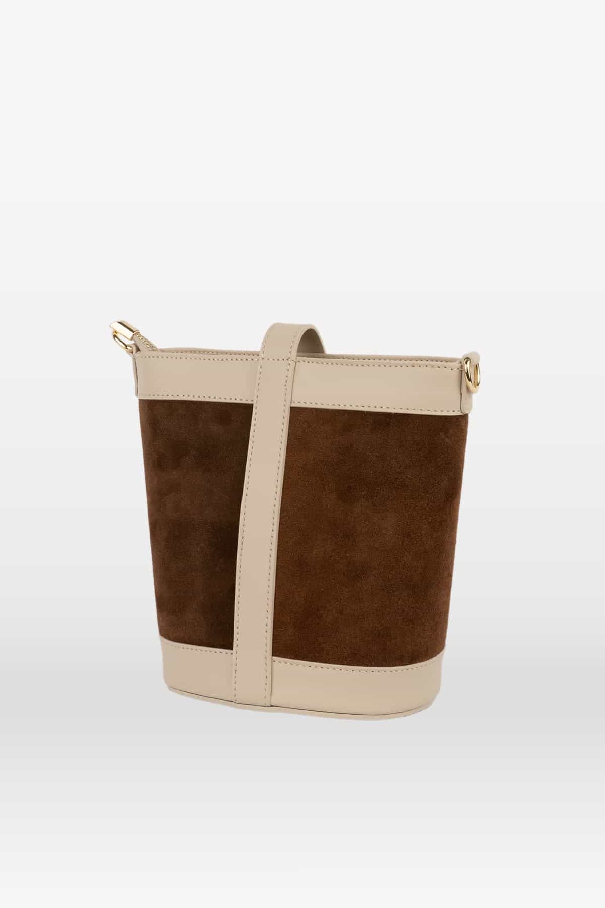 Découvrez le Sac Seau HELLE : un modèle structuré en cuir suédé, rehaussé de finitions en cuir lisse, pensé pour un porté sophistiqué au quotidien.