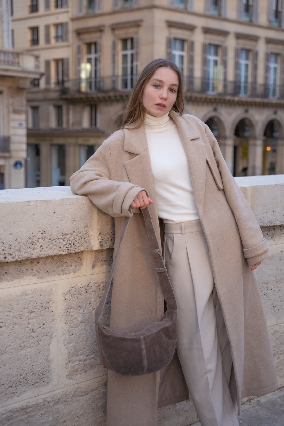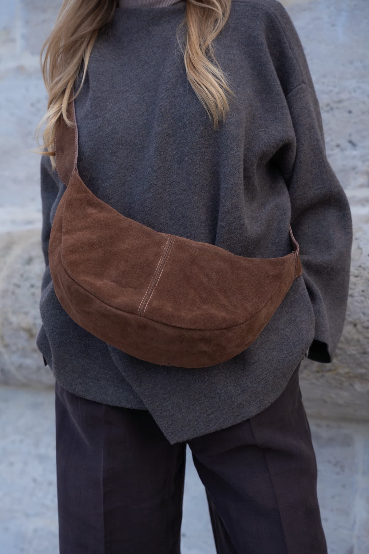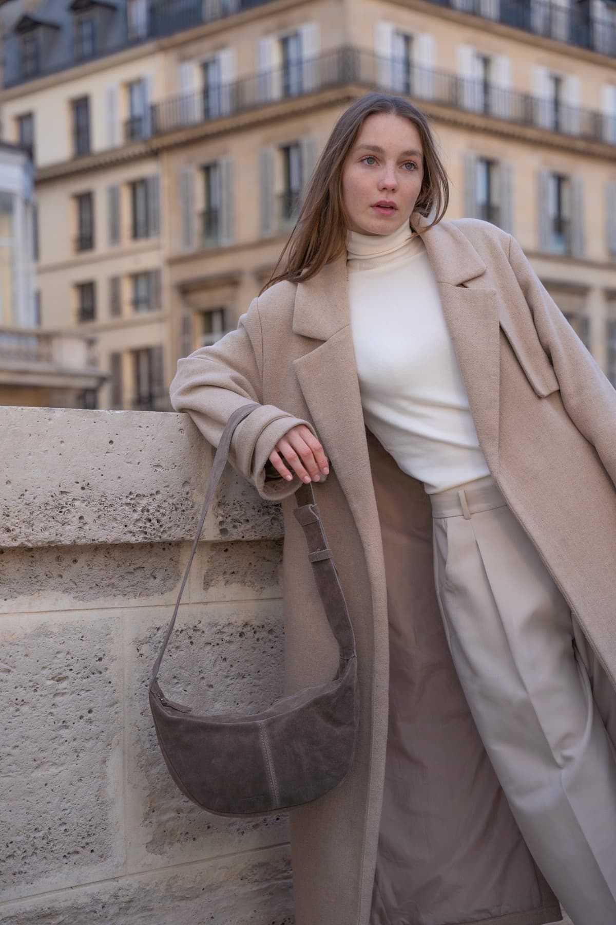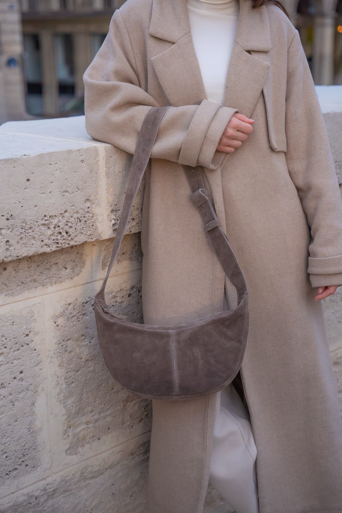 Découvrez ce sac HELSA en cuir de vachette suède, icône minimaliste d’un mode de vie en mouvement. Sa sangle ajustable permet un double porté épaule ou en bandoulière. HELSA a été pensé pour l’essentiel, il contient deux pochettes intérieures dans la doublure du sac, dont une zippée. Dimensions : L 33 cm x H 16 cm.