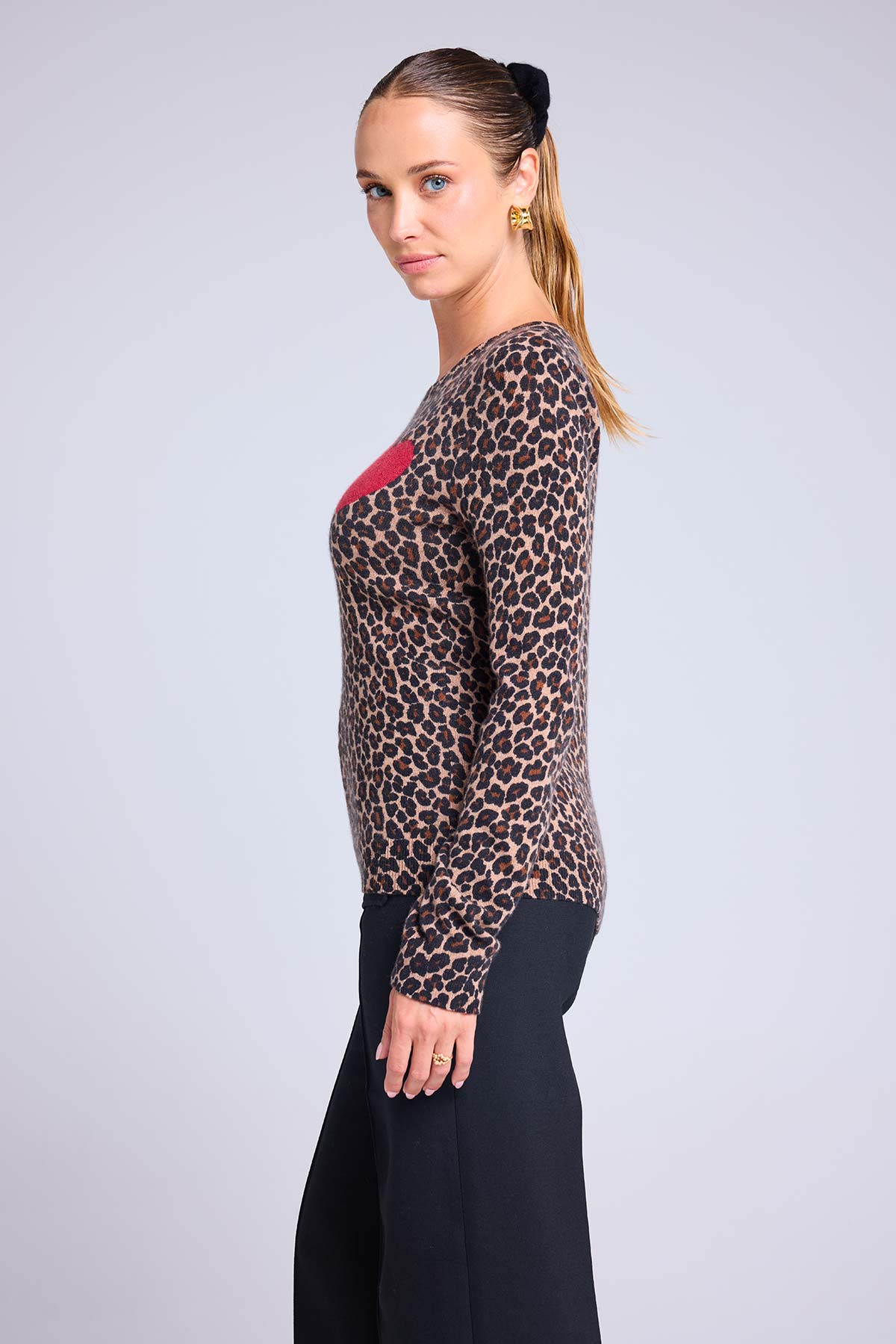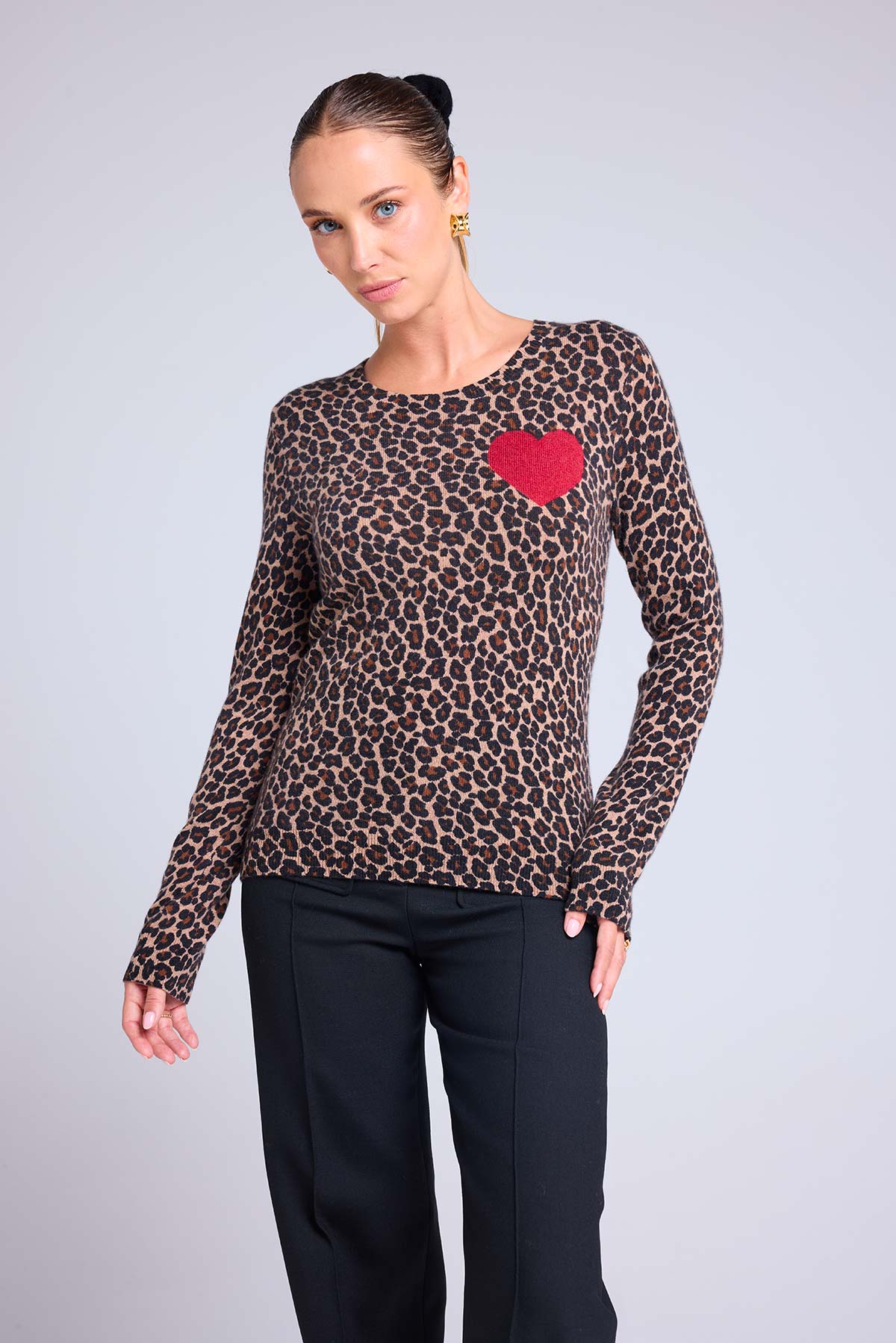 LETIZIA – Pull col rond en 100% cachemire imprimé léopard avec cœur à la poitrine