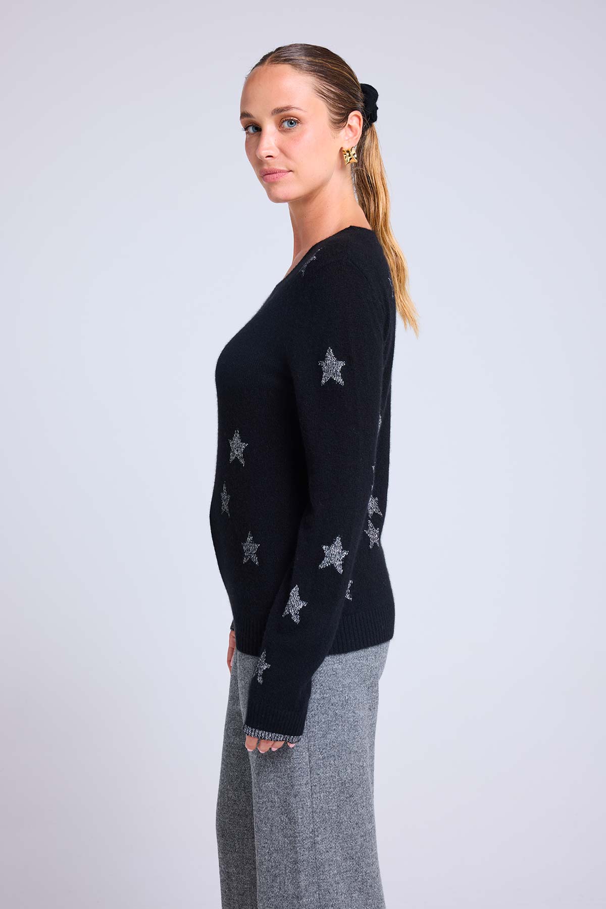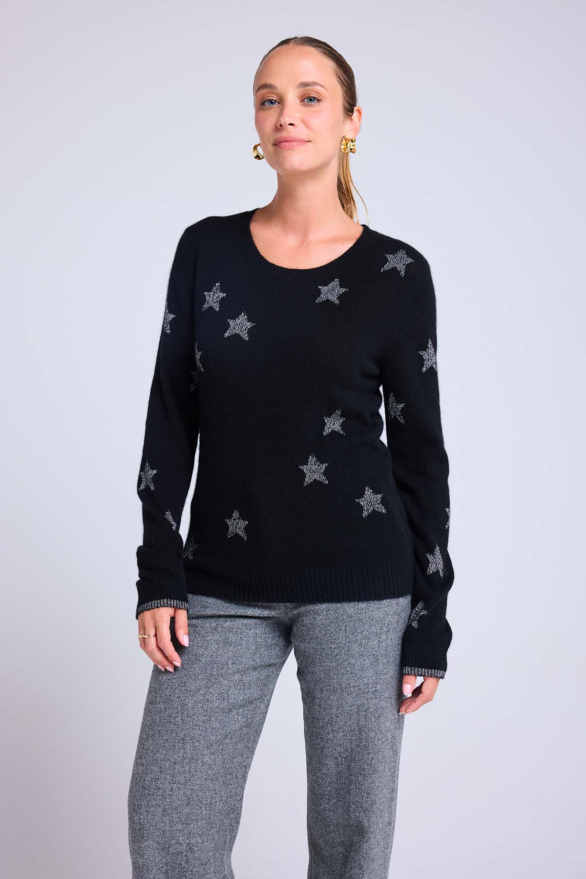 Telle une constellation, des étoiles en lurex multicolor s’invitent sur l’intégralité de ce pull pour twister votre silhouette. Confectionné en 100% cachemire, il dévoile un col rond, des manches longues avec détails lurex multicolor au bout des rib poignets, et des bords côtelés. Mêlant audace et douceur, complétez votre look casual avec une jupe, un pantalon droit ou un jean.