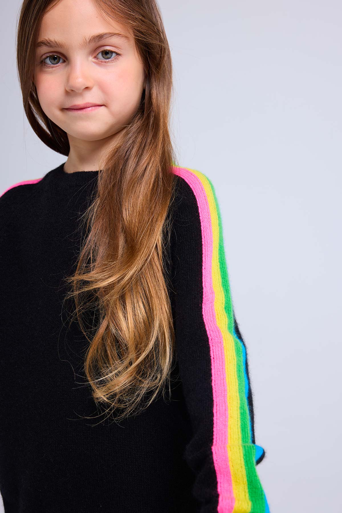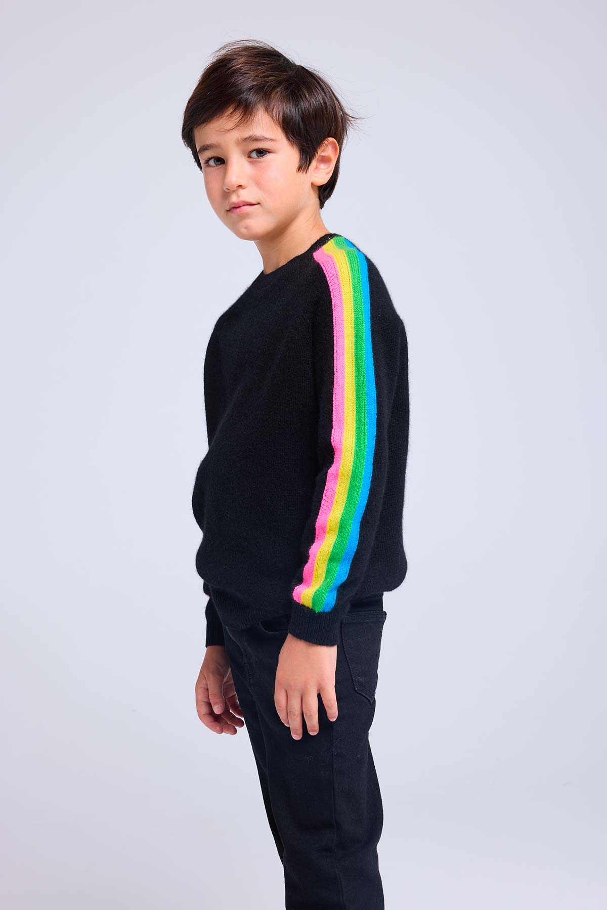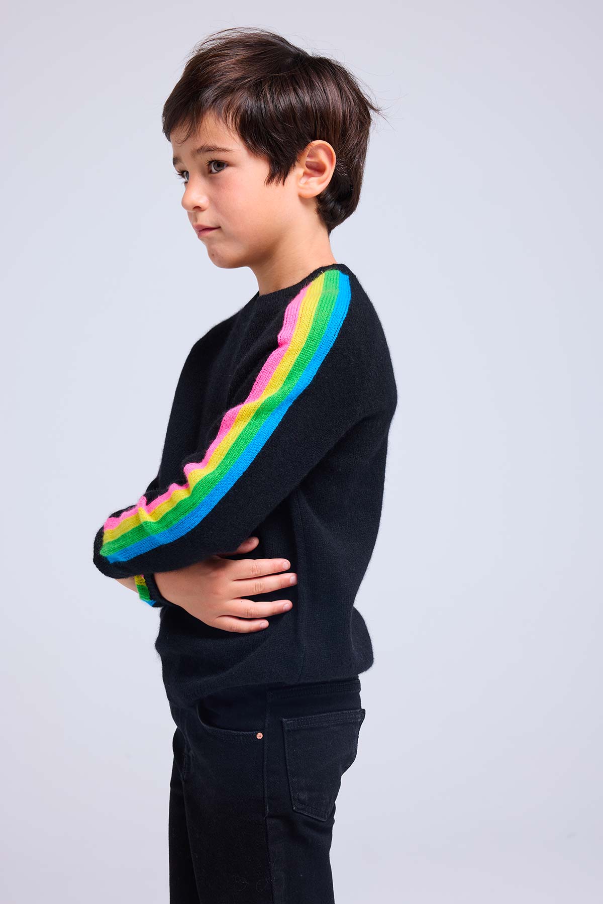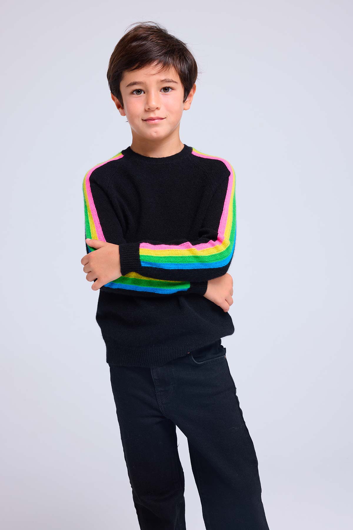 Les enfants peuvent désormais adopter les codes du vestiaire maison héritage sur un mixe and match avec Papa et Maman. Muni d’un col rond et de manches longues, ce pull en 100% cachemire dévoile des bandes arc en ciel sur les bras pour des journées festives.