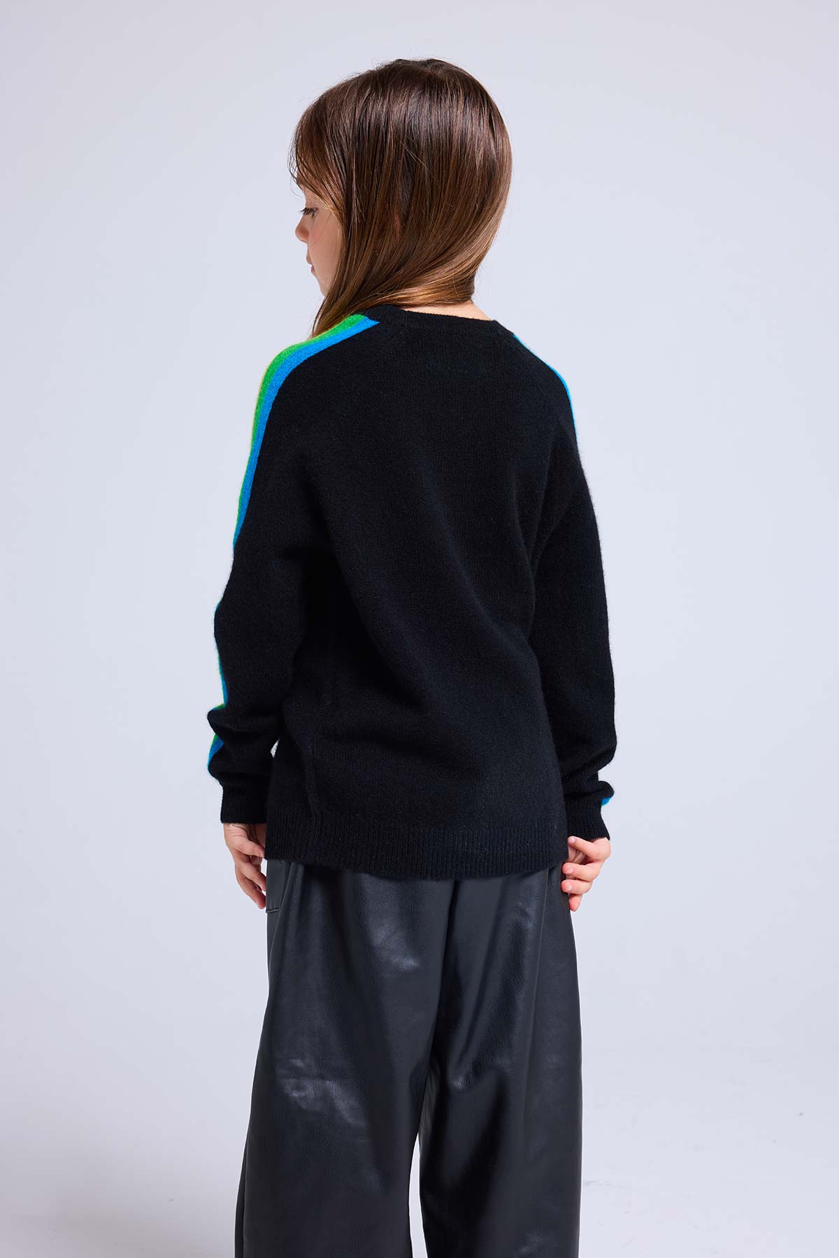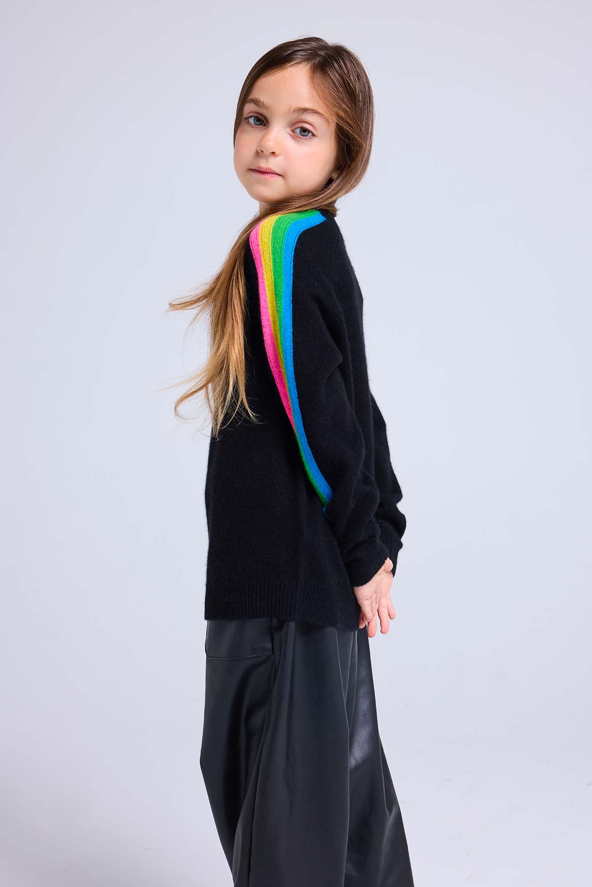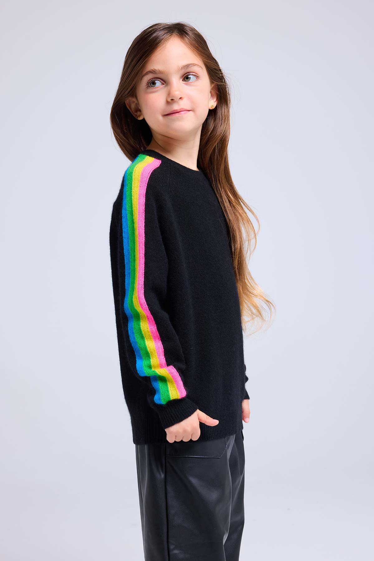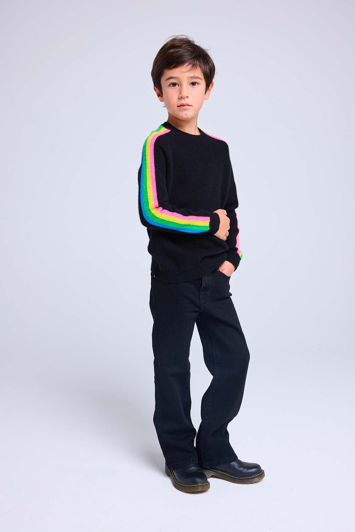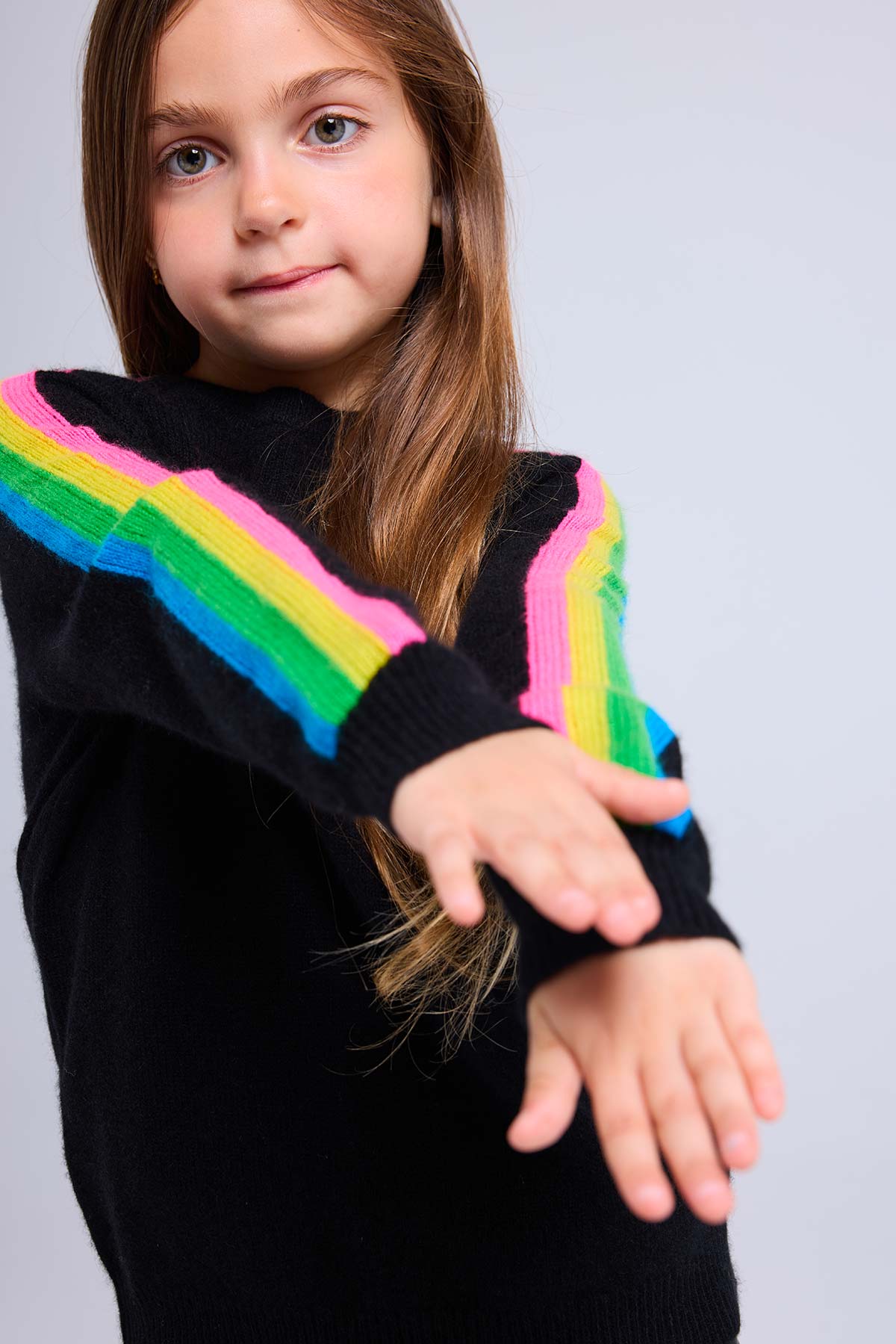 Les enfants peuvent désormais adopter les codes du vestiaire maison héritage sur un mixe and match avec Papa et Maman. Muni d’un col rond et de manches longues, ce pull en 100% cachemire dévoile des bandes arc en ciel sur les bras pour des journées festives.