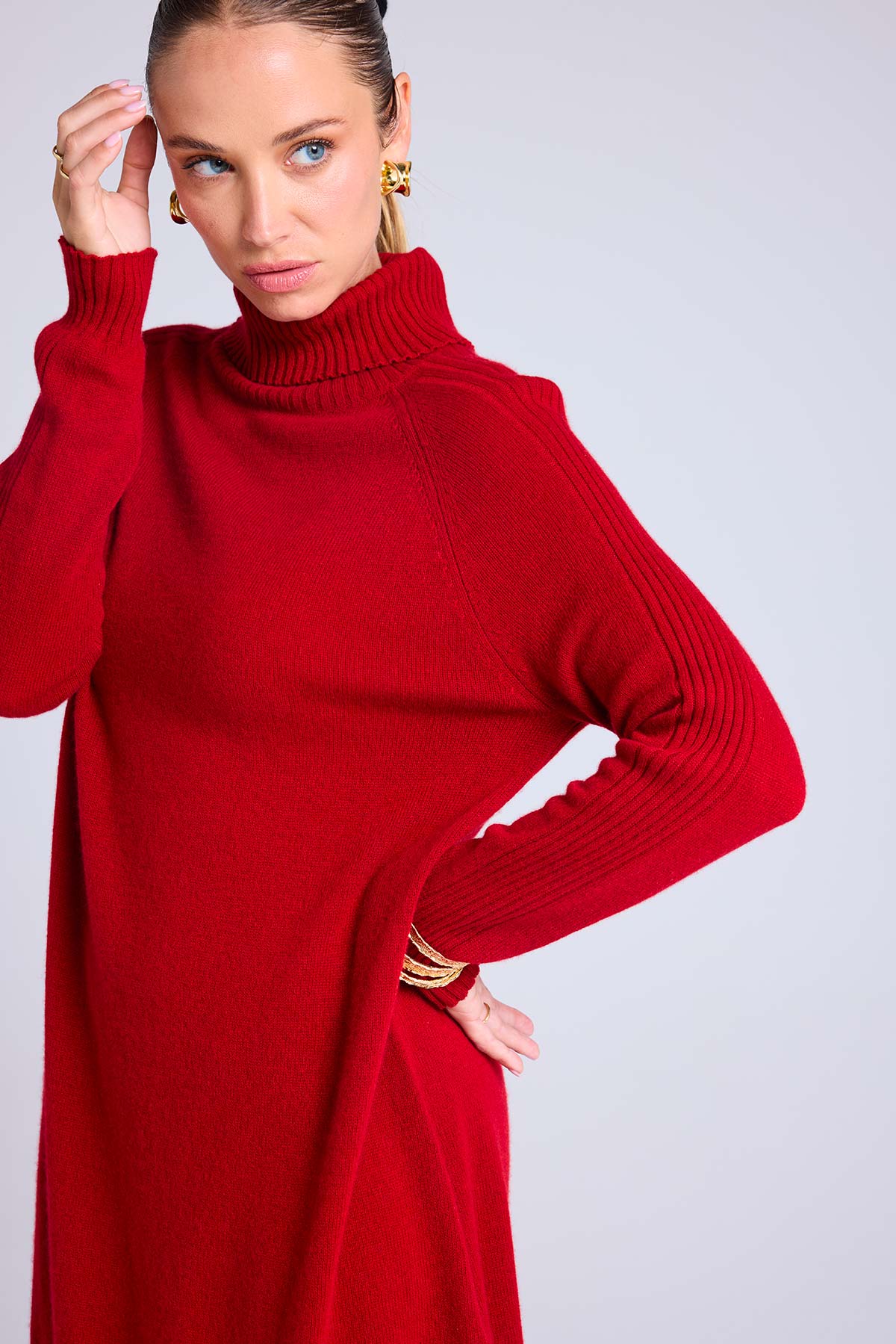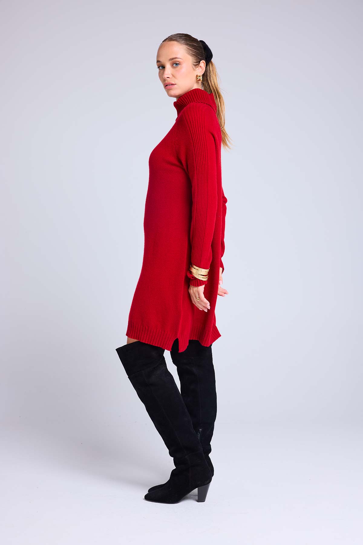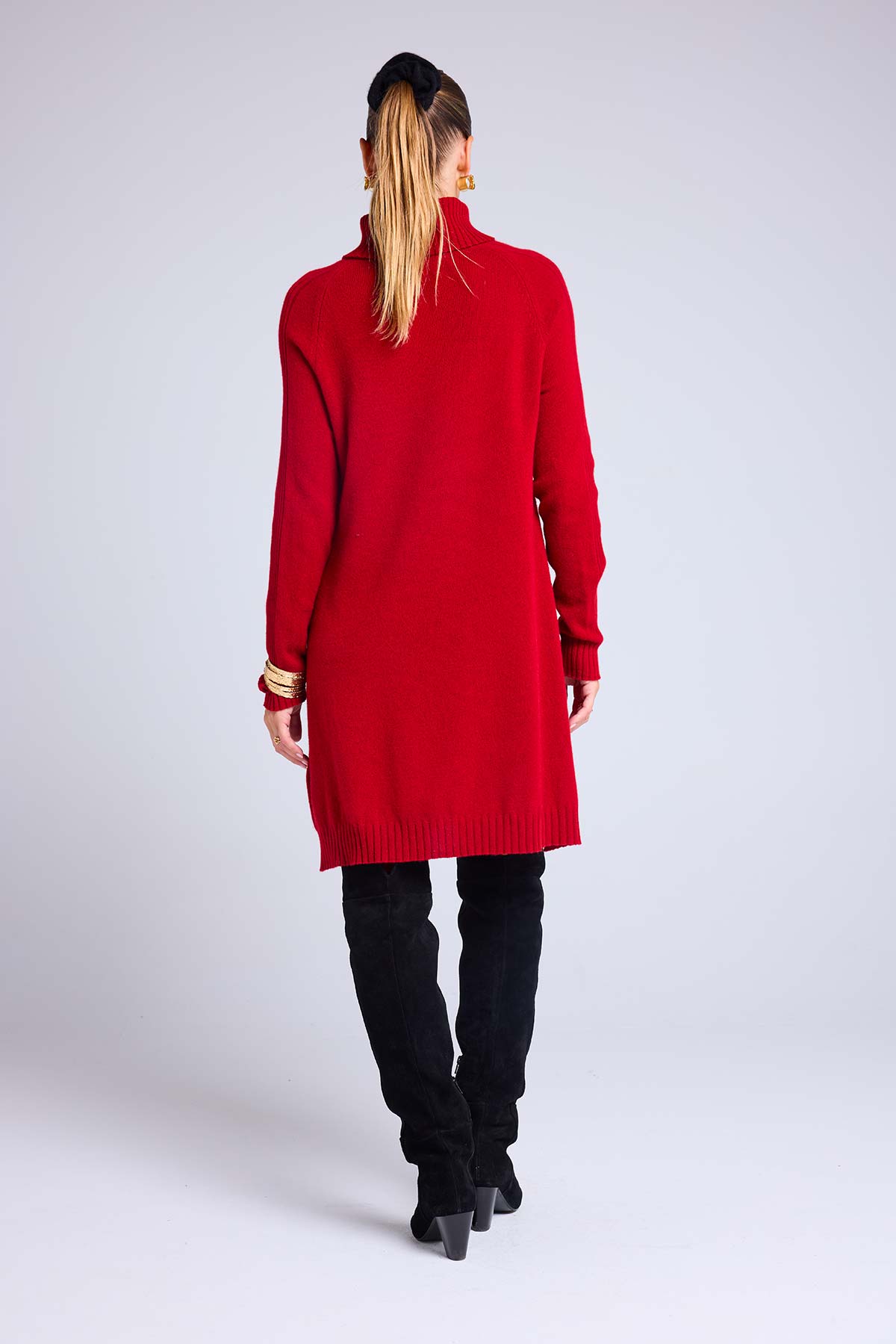 Robe ample, col roulé, à manches longues en cachemire avec des fentes latérales. Un jeu de côtes vient délicatement souligner la forme du vêtement sur les manches. Une pièce précieuse, destinée à durer toute une vie, qui souligne le savoir-faire maison héritage et crée une silhouette moderne et féminine. Sa coupe est ample et décontractée.
