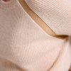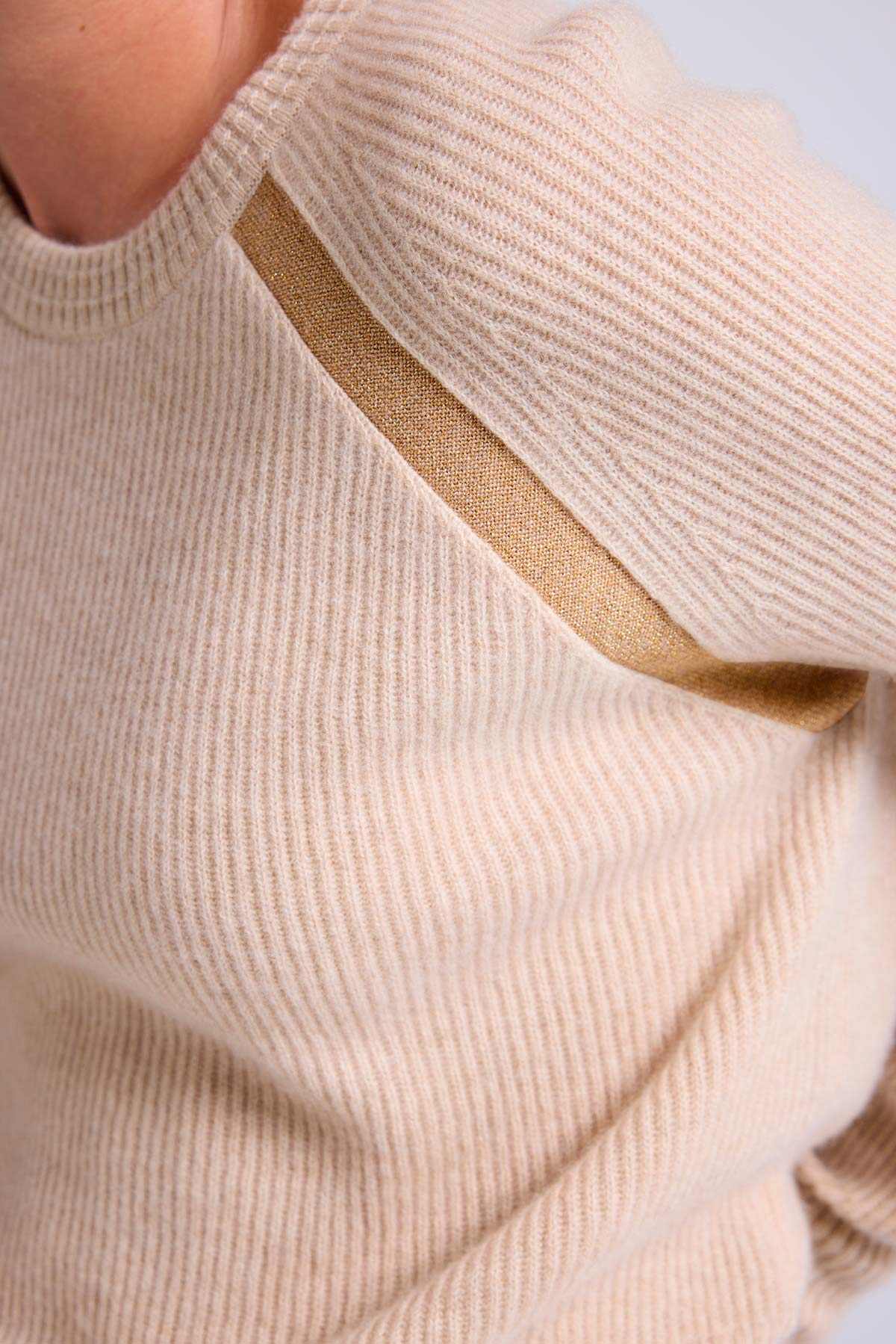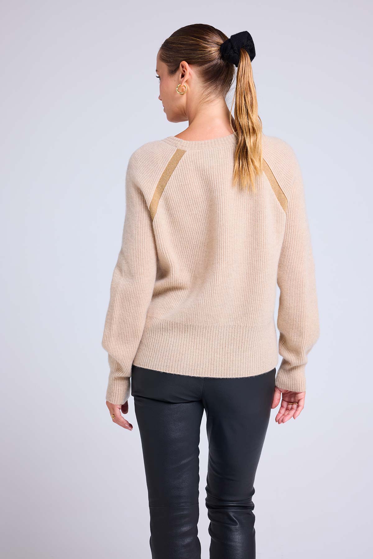Tricoté en 100% cachemire, il se distingue par de fines bandes en lurex qui soulignent les coutures raglan, apportant une touche subtile de lumière à la silhouette.