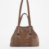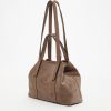 Cabas en cuir avec intérieur en daim, comprenant une pochette indépendante attachée par une chaîne, et fermé par une fermeture à glissière.