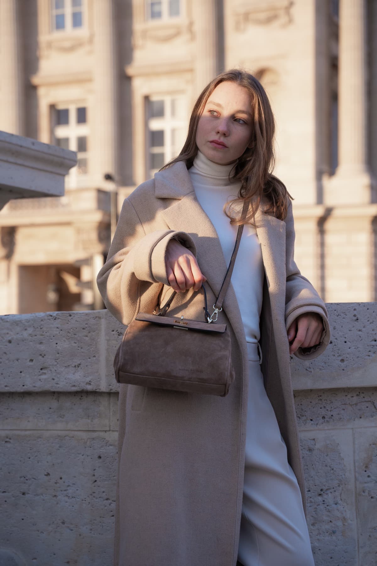 L’icône minimaliste au format idéal. Cette pièce de maroquinerie sophistiquée est façonnée dans un cuir suède au toucher velouté. Ce design lui confère une douceur sensorielle, son volume est maîtrisé et rehaussé d’un loquet doré à la finition soignée. Malgré sa taille compacte, son organisation interne est impeccable grâce à deux compartiments séparés, offrant une praticité maximale.