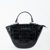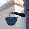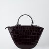 Ce sac à main en cuir croco se distingue par sa forme demi-lune originale et structurée.