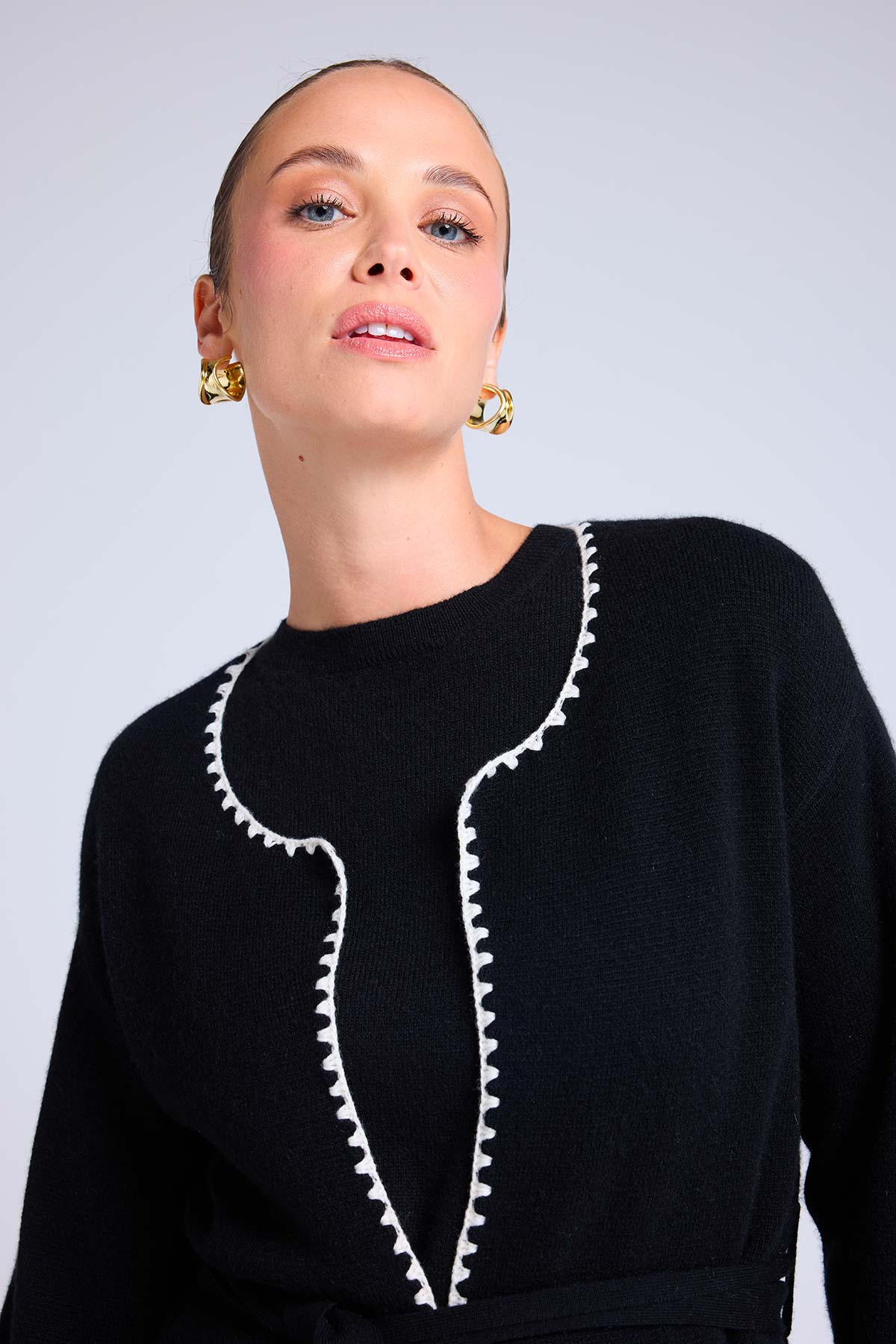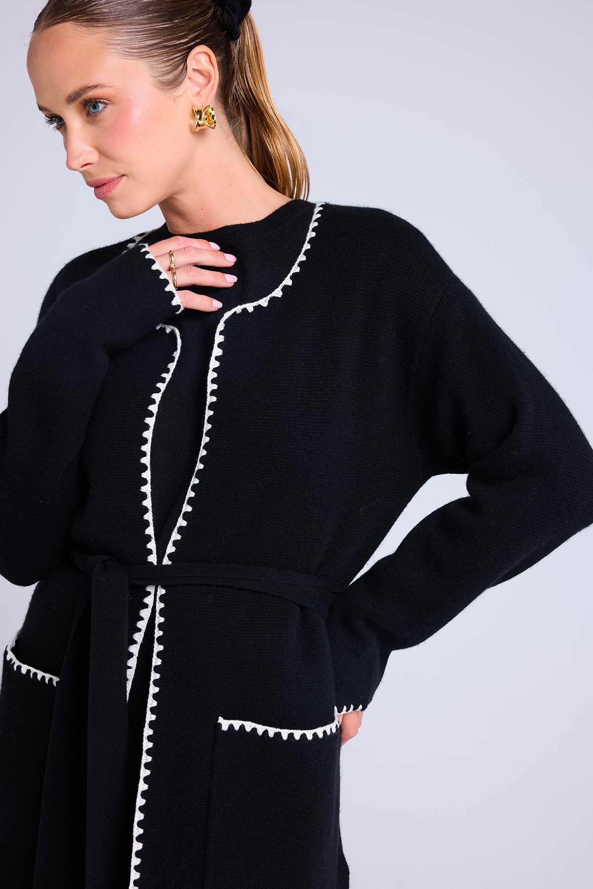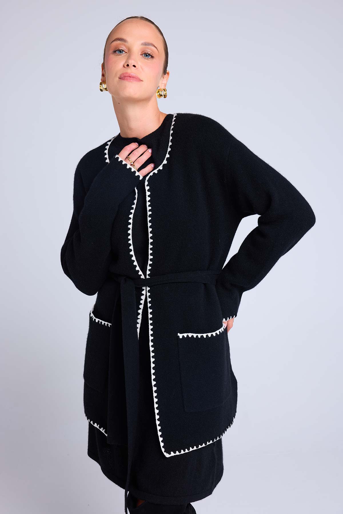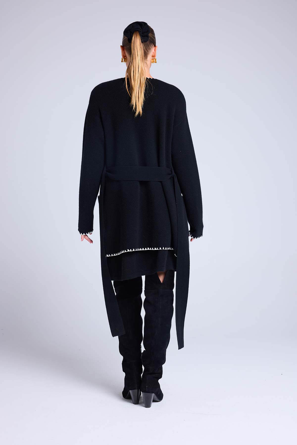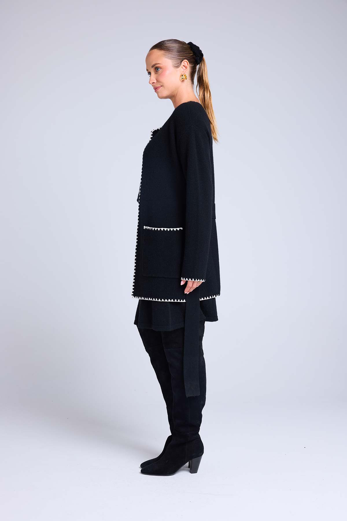 Sa coupe longue et droite dessine une silhouette élancée, mise en valeur par de fines bordures contrastées qui soulignent chaque ligne.