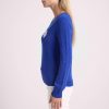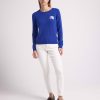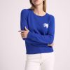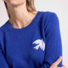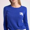 Mettant en valeur le savoir-faire de la Maison, la colombe est tricotée en intersia comme une broderie avec des fils blancs qui contrastent avec le fond uni bleu royal.