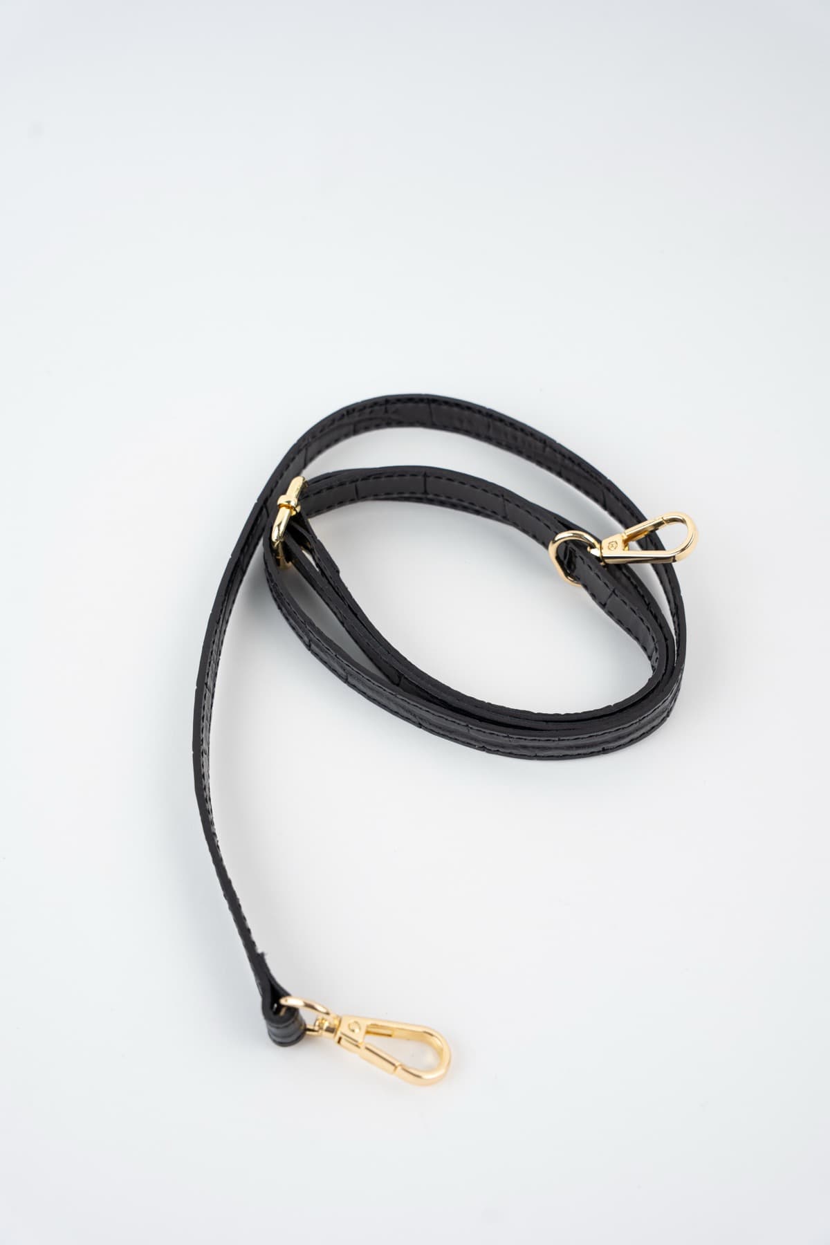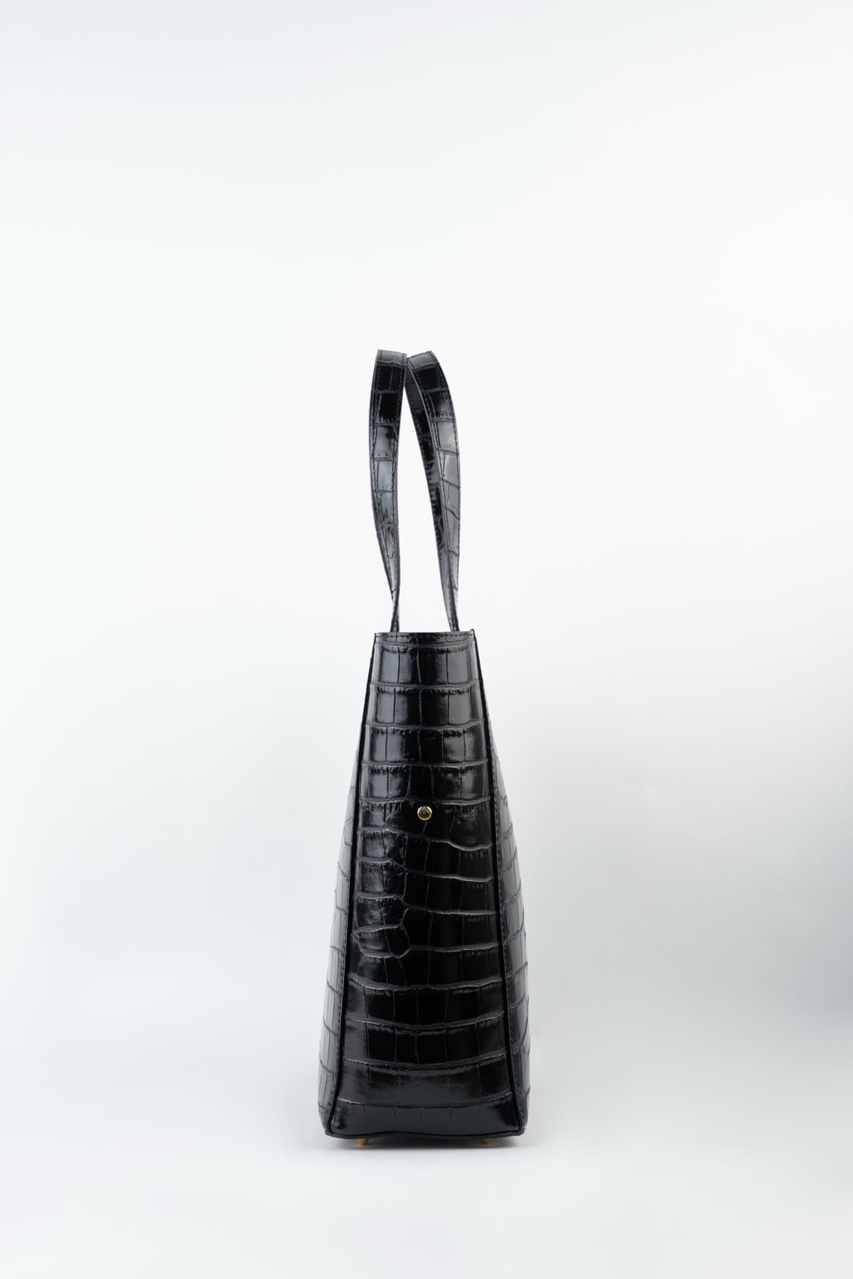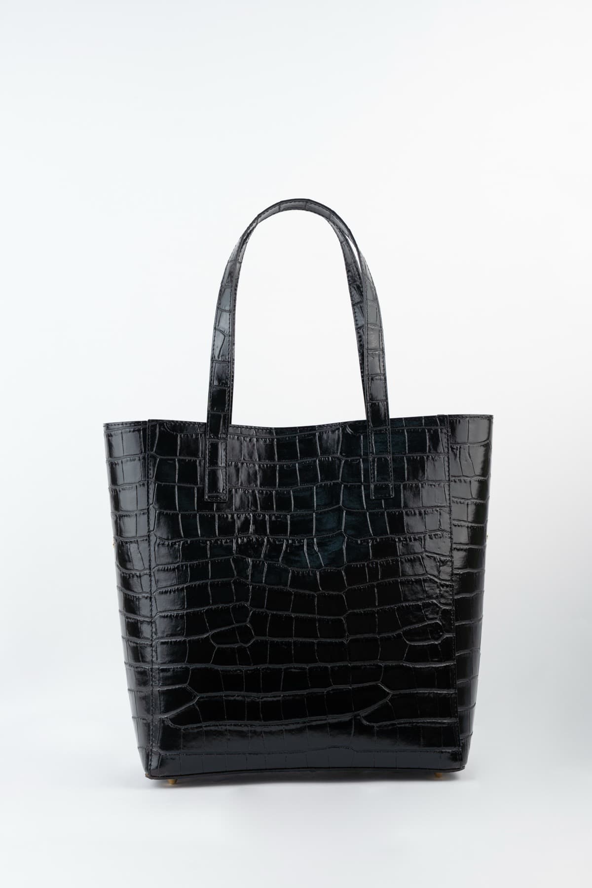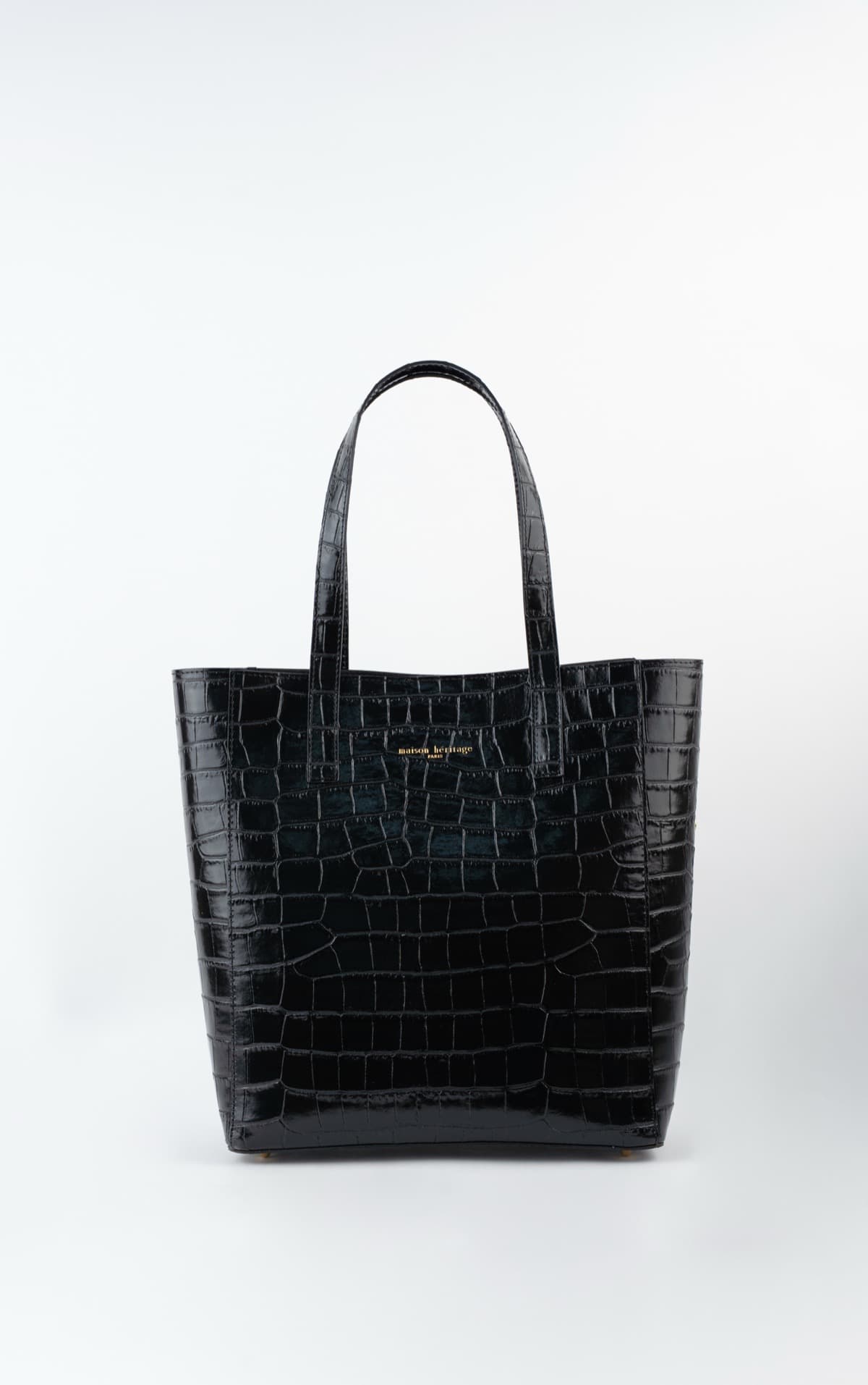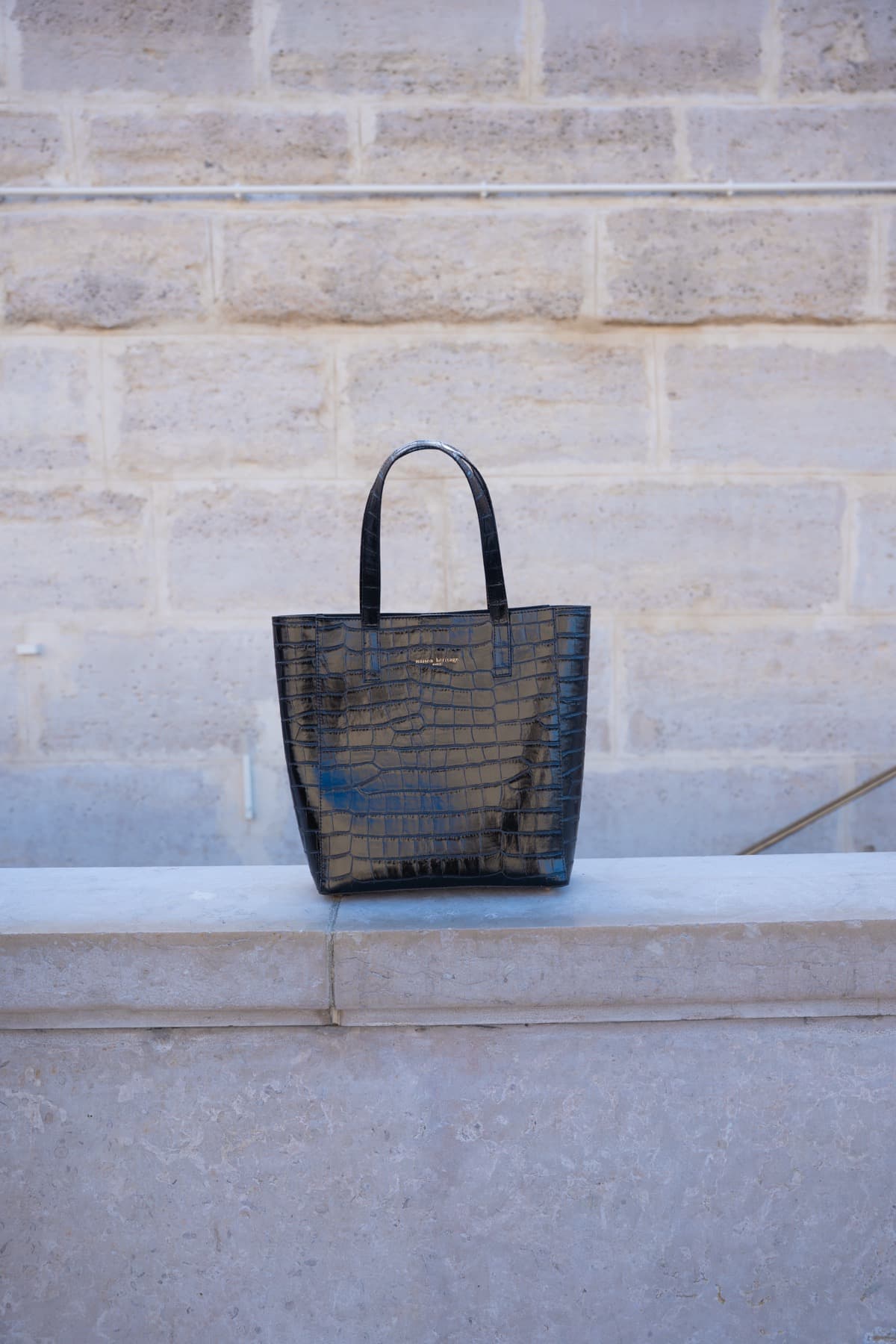 Type de sac : Sac cabas Matière : Cuir croco Couleur : Noir Dimensions : 28 x 32 x 12 cm Anses : Souples (porté main/épaule) Structure : Plutôt rigide , forme rectangulaire évasée vers le haut, 2 crochets à l’intérieur Accessoires : Livré avec une sangle amovible et ajustable pour un porté croisé/bandoulière
