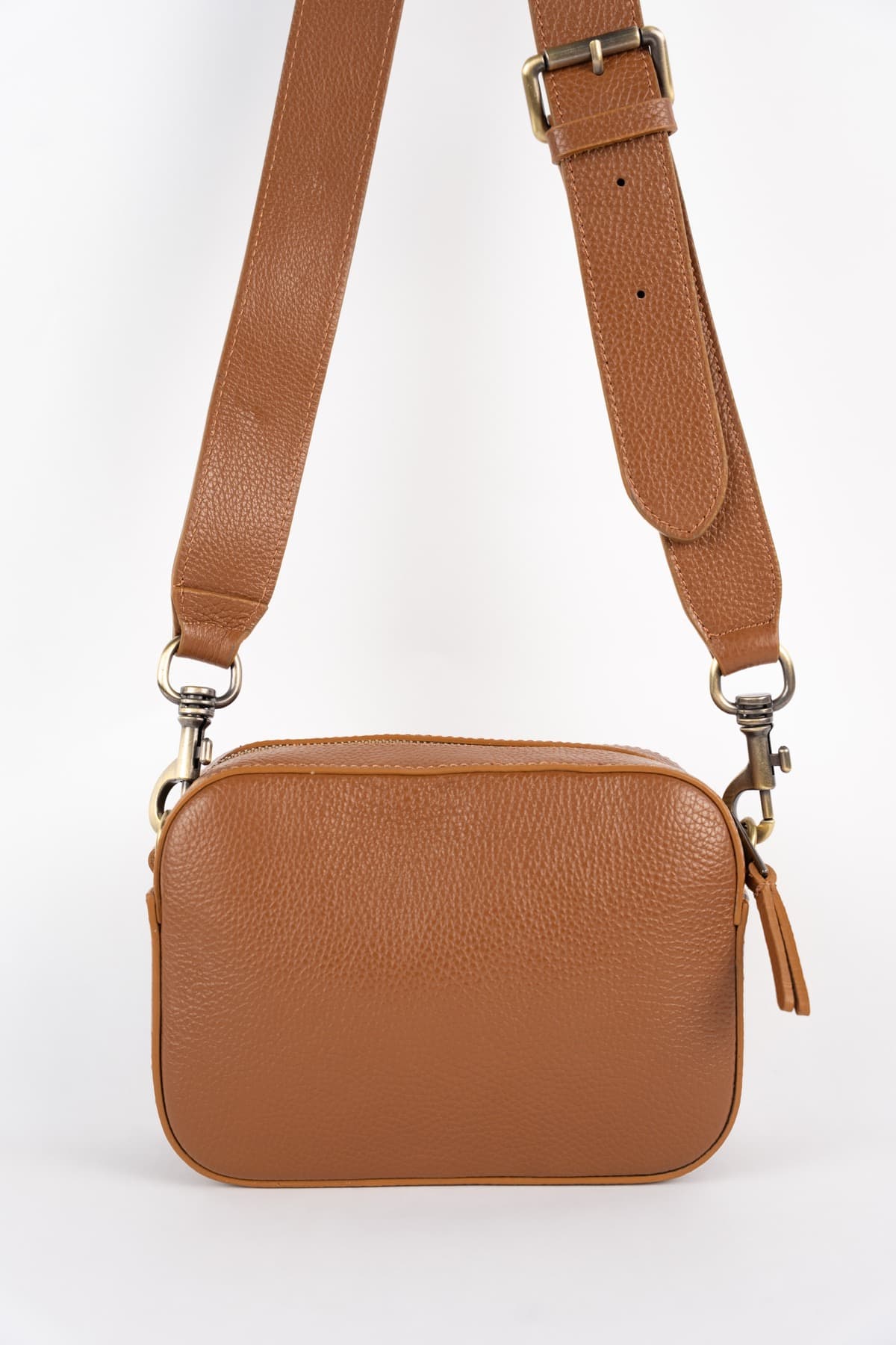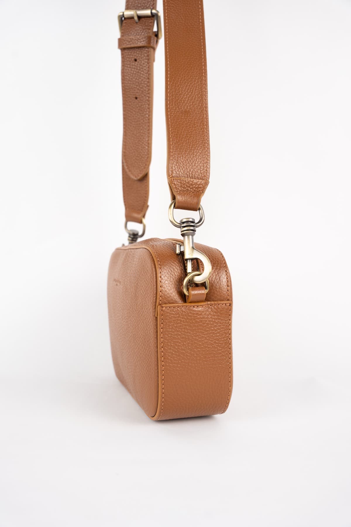 Type de sac : Sac pochette/bandoulière forme rectangulaire Matière : Cuir de vachette Couleur : Camel Foncé Dimensions : 21 x 15 x 6 cm Structure : Semi-souple Fermeture : Zippée couleur dorée Sangle : Bandoulière large pour un porté croisé/épaule