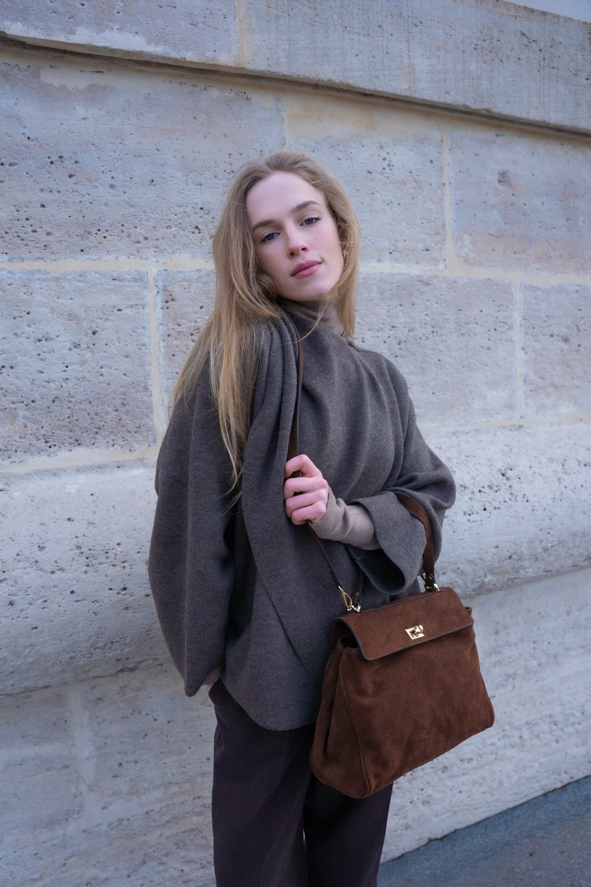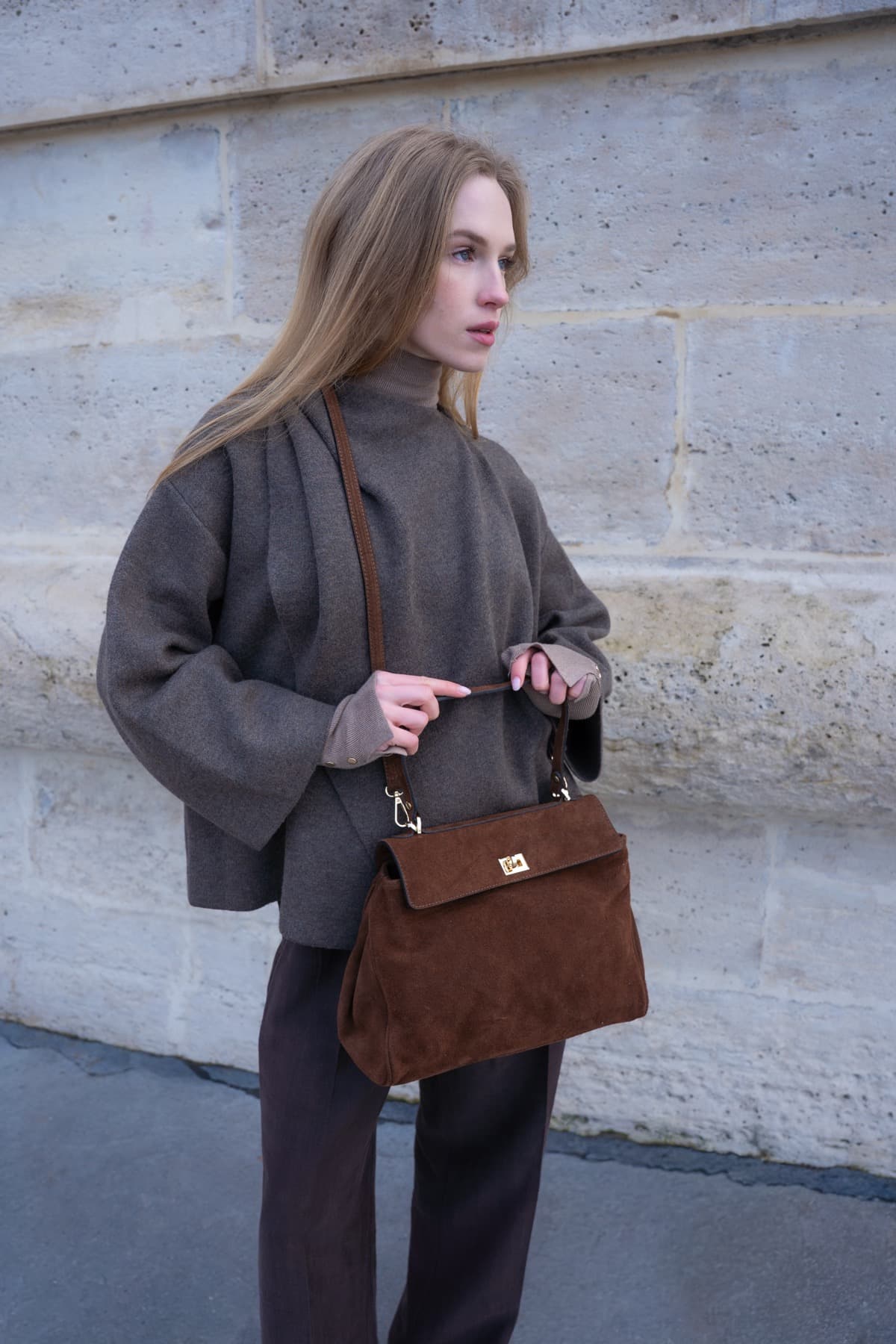 L’icône minimaliste à la contenance optimisée. Cette pièce de maroquinerie sophistiquée est façonnée dans un Cuir suède au toucher velouté. Son design lui confère une douceur sensorielle, et son volume parfaitement équilibré est rehaussé d’un loquet doré à la finition soignée. Son organisation interne est impeccable grâce à deux compartiments séparés, offrant une praticité maximale pour le quotidien. Il est livré avec une sangle amovible et ajustable qui permet un usage modulable : porté croisé, porté-épaule ou en bandoulière. C’est la signature élégante pensée pour le mouvement. Dimensions 30cm x 20 x 13 (longueur x hauteur x largeur)