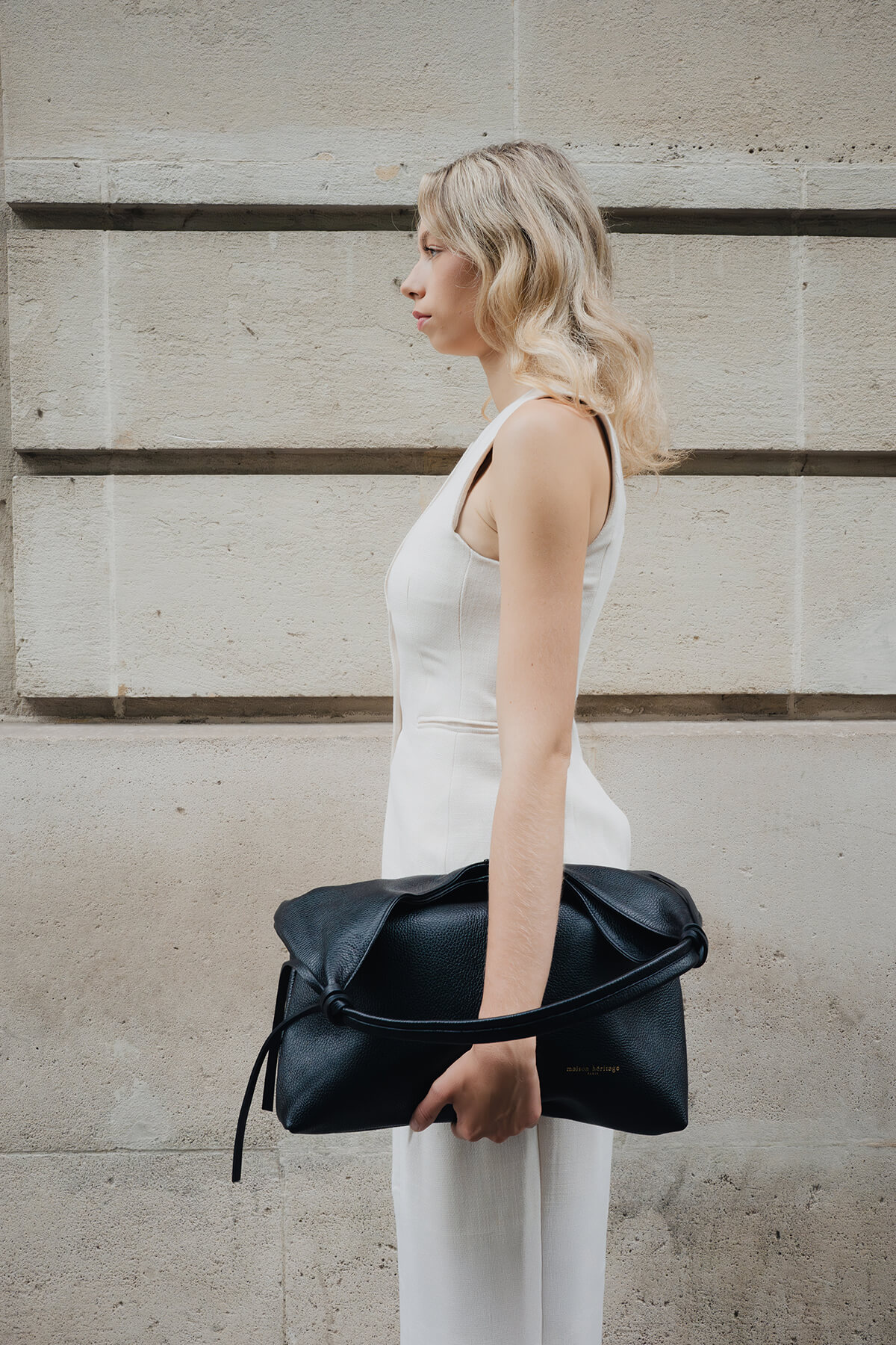 Découvrez le sac TEJO, un modèle élégant qui privilégie un porté confortable et sécurisé au quotidien. Sa structure souple et ses détails de rubans décoratifs lui confèrent une allure singulière et raffinée.