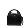 Sac à main en cuir avec une séparation centrale comprenant une poche avec fermeture à glissière et une poche intérieure zippée à une extrémité, et une poche sans fermeture éclair à l’autre. Fermeture magnétique. Bandoulière ajustable et amovible.