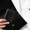 Portefeuille en cuir avec porte-cartes amovible, poche intérieure zippée et une poche extérieure à l’avant.